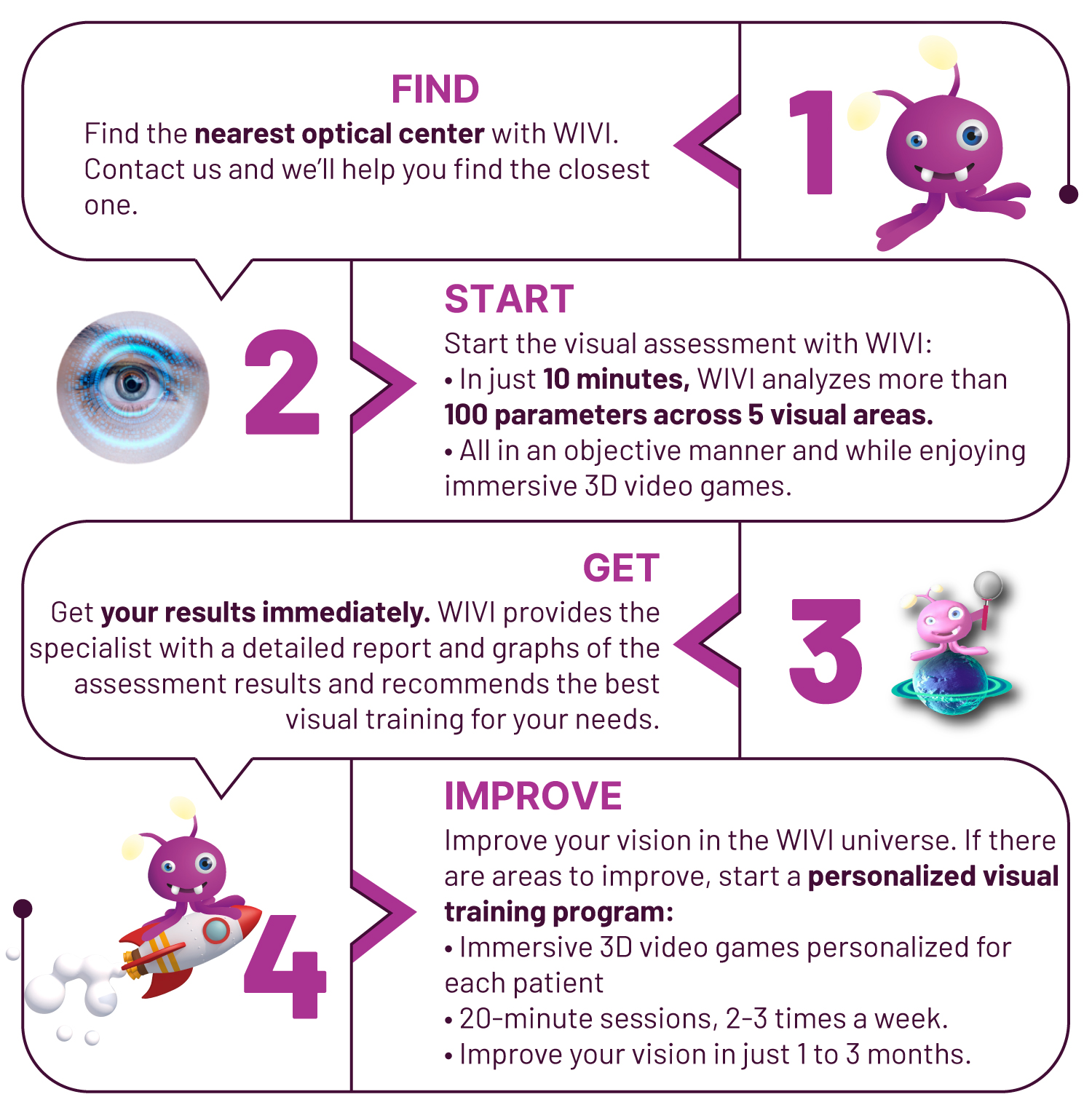 WIVI assesses your visual efficiency in 10 minutes and helps you improve it in less than 3 months with visual training through immersive, personalized 3D video games.